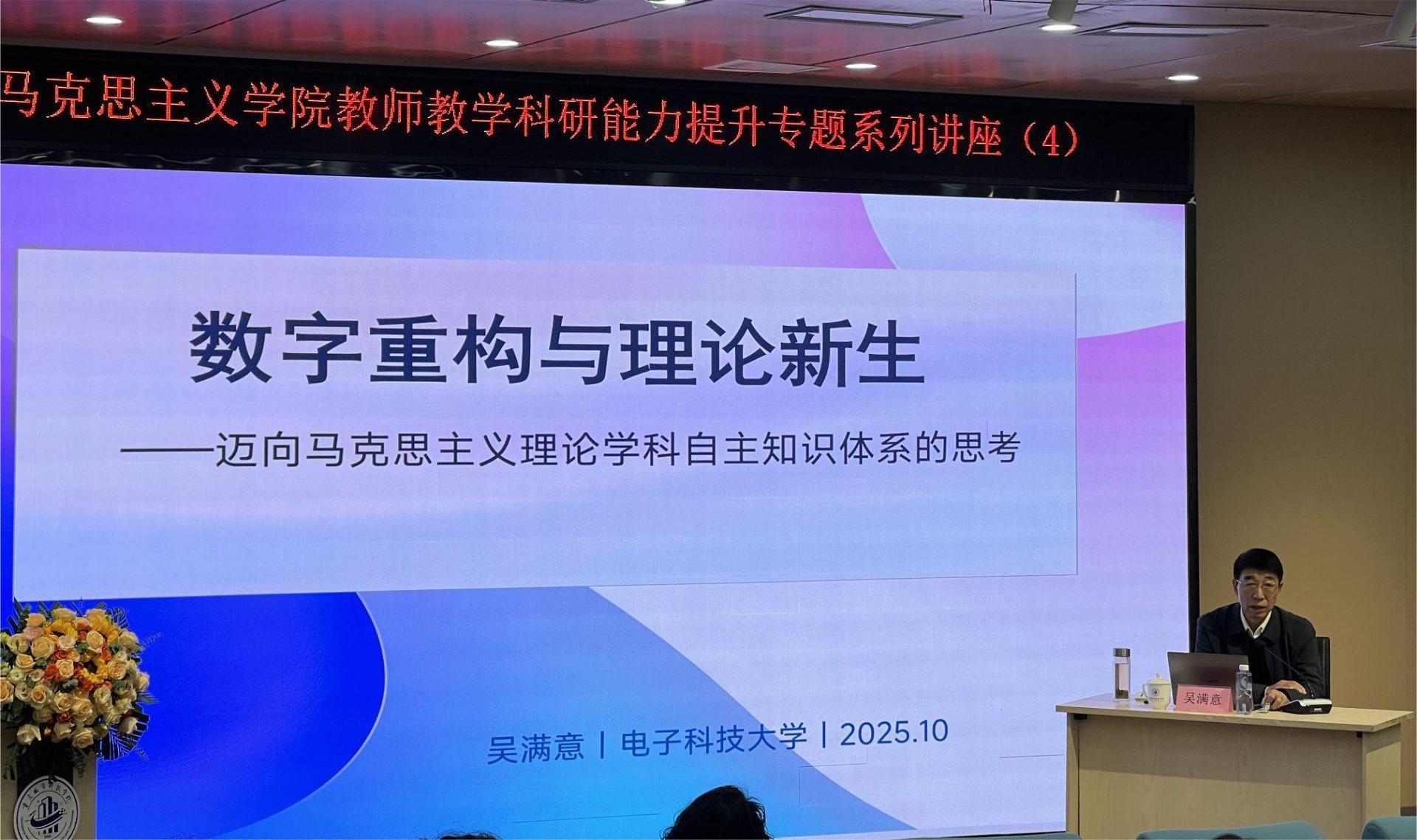 为了落实贯彻教育部《思想政治理论课课堂教学提升行动》和学校科研工作部署,助力数字赋能思政课教学,提升教师科研创新能力,10月29日下午,马克思主义学院在第二报告厅成功举办了第四场“教师科研能力提升专题讲座”。本场讲座的嘉宾是国家级高层次领军人才、四川省学术和技术带头人、教育部全国高校思政课名师工作室(电子科技大学)首席教授、四川省社会科学高水平研究团队负责人、四川省名师工作室负责人、电子科技大学马克思主义学院院长、博士生导师吴满意教授。马克思主义学院全体教师现场聆听了本次讲座。讲座由段吉福院长主持。 吴满意教授以《数字重构和理论重生——迈向马克思主义理论学科自主知识体系的思考》为题,结合生动的案例,阐释了数字技术是推动理论新生与教学创新的强大内驱力,马克思主义理论学科的“数字化转向”已是既成事实,思政课教师应主动适应这已转向方能引领未来。 吴教授指出,思政课教师要将新现象作为新理论的“试验田”,开展学科交叉融合研究。他认为,数智时代锻造标志性概念尤为重要,要将经典概念当代化,从“阐释经典”走向“与经典对话并创造经典”。要构建构建扎根中国的马克思主义自主知识体系,就要推动马克思主义理论的中国化、时代化、数字化,强化理论对当代中国数字实践的解释力与引领力。要让马克思主义不仅成为“批判的武器”,更要成为“武器的批判”,塑造公正、普惠的数字社会主义未来。 段吉福院长在点评时指出,吴满意教授以“数字重塑”为切入点,既深入剖析了数字时代马克思主义理论创新的逻辑起点,又结合具体案例给出了教学科研转化的路径,让“理论新生”不再是抽象概念,而是可落地的方法论。整场讲座从理论高度到实践指导,从宏观趋势到微观操作,既展现了吴教授宽广的学术视野,也饱含对一线思政教师成长的关切。希望教师们将讲座中的启发转化为优化教学方法、突破科研瓶颈的实际动力,不断提高课堂教学质量。(传媒中心 张学强/编辑)
