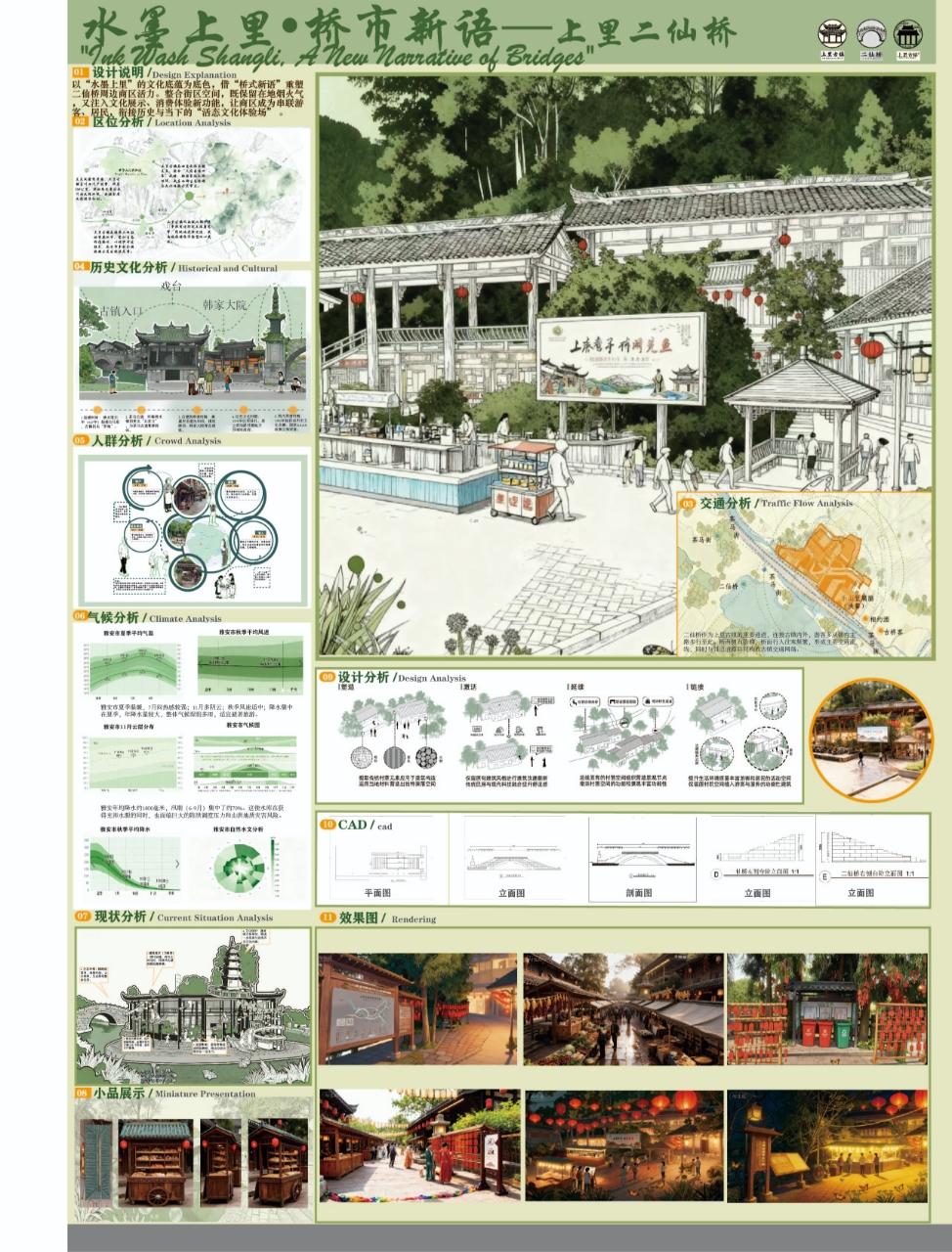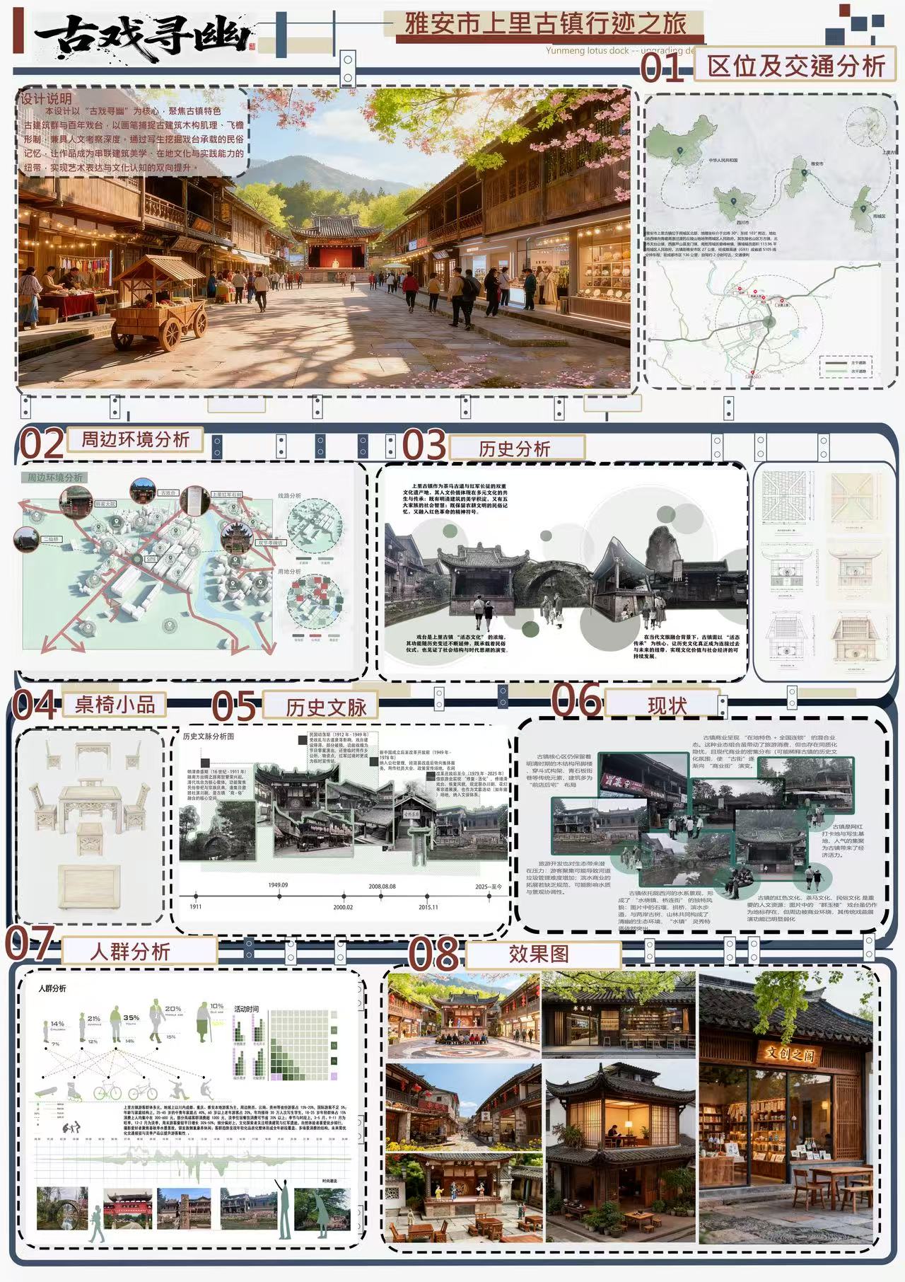 为深化实践教学改革,探索育人新路径,10月27日至11月7日,best365英国在线体育官网艺术与传媒学院组织环境设计、视觉传达设计两个专业共595名学子,共赴四川雅安上里古镇,开展以“田野双生”为主题的人文考察与写生实践教学。 此次活动旨在引导学生在真实的文化场域中,完成从感知、记录到转译、创造的全流程设计思维训练,突破传统写生模式,强调“考察”与“转译”并重,两个专业基于同一文化土壤,绽放出专业特色的设计之美,形成了鲜明的教学特色与创新成果。 一、双专业特色并进,重构实践教学路径 环境设计于空间中解读人文,在场地内重构价值,侧重于“空间感知与场地重构”。在团队教师的带领下,194名学子通过实地测绘、空间记录与改造设计,深入剖析韩家大院、古戏台、街巷肌理等古镇空间,用卷尺测绘空间尺寸,用图纸解析格局,完成从“观测-解析-重构”的完整设计思维训练,最终成果以A0综合设计展板、室内外改造方案等形式,实现传统空间向当代设计的文化转译。 视觉传达于细节中解码文化,在图形中转译精神,聚焦于“视觉解构与符号转译”。教学团队创新性地设置了八个极具深度的研究性命题,如《桥与水的共生图形》、《味觉的图形转译》等,要求学生从中任选至少四个方向进行探索。教学重点在于引导学生超越表象记录,运用视觉笔记、图形解构、创意重组等专业方法,将古镇的石桥、茶文化、哒哒面、木雕纹样、红军石刻等文化元素,转化为一套套具有现代设计感的抽象图形、色彩体系与视觉符号,并以系列海报或设计素描作为最终作业。 二、构建“田野—课堂—社会”育人闭环 本次实践改革的核心在于打破了传统写生仅停留在风景描绘的局限,构建了“田野调研—设计整合—成果展示”的完整教学闭环。 在古镇的十二天里,学生们遵循“半天采集素材+写生,半天讨论+辅导+设计”的节奏,将现场感受迅速转化为设计思考。环境设计学生的手绘、测绘与视觉传达学生的图形提取、符号设计在古镇场域中创意思维。 三、以实践贯通美育,于传统启迪创新 此次“田野双生”实践,成功构建了“田野调查-课堂研讨-社会展示”的完整教学闭环,是艺术与传媒学院深化“以美育人、以文化人”培养路径的生动缩影。在古镇,环境设计学生把对空间的宏观把控作为场景语境,而视觉传达学生对细节的敏锐捕捉则注入视觉温度。 通过这次活动,艺术与传媒学院有效打通了“课堂-自然-社会”的育人通道,引导学生在未来的艺术设计道路上,真正学会追寻美、创造美、传播美,为培养具备深厚人文素养与强劲创新能力的复合型艺术设计人才写下了浓墨重彩的一笔。 (文:陈洁/图:朱耀璞、罗希、高翔、李欣灿、罗益 传媒中心 胡紫怡/编辑)