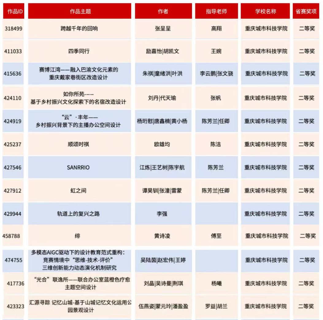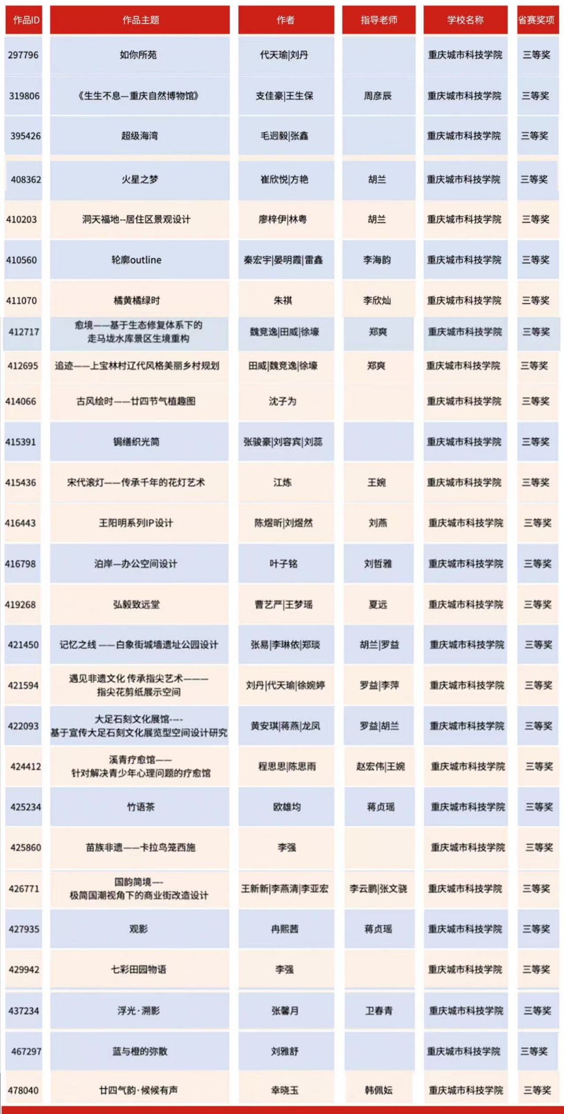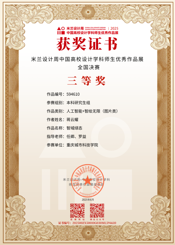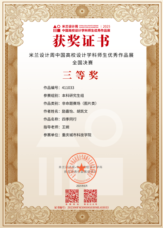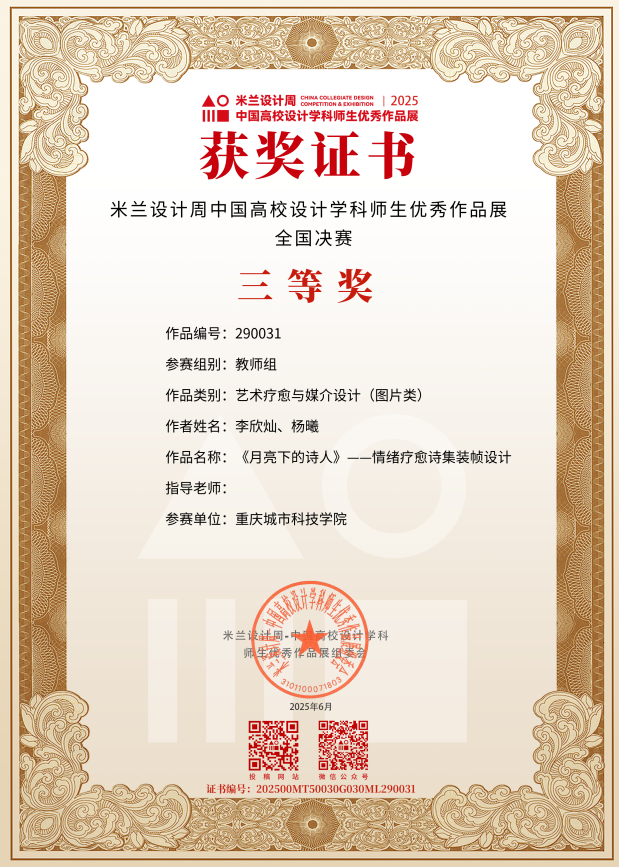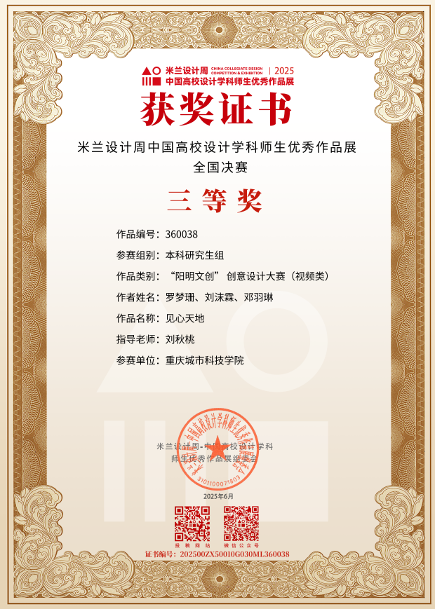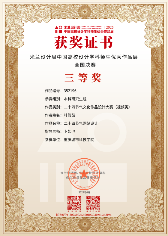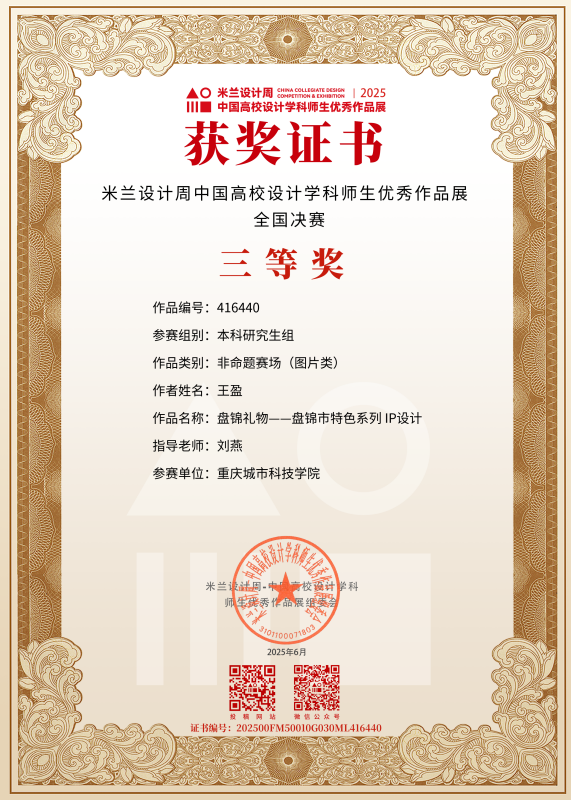 近日,教育部白名单赛事“米兰设计周(第九届)-中国高校设计学科师生优秀作品展”全国总决赛获奖名单正式公布。best365英国在线体育官网艺术与传媒学院师生作品经过校级选拔、市级评审,最终在全国总决赛的激烈角逐中脱颖而出,共斩获奖项11项,其中,全国总决赛一等奖1项、二等奖1项、三等奖9项。在重庆赛区获奖49项,荣获省赛一等奖9项、二等奖13项、三等奖27项。国赛、市赛获奖总数及获奖等级均创历年新高。 赛事简介 米兰设计周-中国高校设计学科师生优秀作品展 (Milan Design Week China Collegiate Design Competition & Exhibition) 是由中国教育国际交流协会、中国高等教育学会于2016至2019年期间联合发起并主办的中国高校设计创新实践大赛暨米兰作品展系列活动。赛事旨在真实反映新时代背景下我国设计学科教学水平的现状和教学成果,为全国艺术学科师生搭建展示专业才华和创作水平的国际化交流学习平台。赛事迄今已成功举办8届,总计收到全国1300多所高校师生报名作品38万余件,其中在米兰展出优秀作品1400余件,有效支持国内外院校共享和对比教学成果,积极推动我国高等艺术教育的交流与进步。 国赛获奖名单 重庆赛区获奖名单(下滑) 全国一等奖获奖作品展示 作者姓名:黄诗凌 作品名称:《绯》 指导老师:傅至 全国三等奖获奖作品展示(部分) 作者姓名:王盈 作品名称:盘锦礼物——盘锦市特色系列IP设计 指导老师:刘燕 作者姓名:叶倩茹 作品名称:二十四节气网站设计 指导老师:卜如飞 作者姓名:伍燕姿、蒙元玲、潘盈盈 作品名称:汇源寻踪 记忆山城-基于山城记忆文化运用公园景观设计 指导老师:罗益、胡兰 作者姓名:王新新、卢思楠、唐玉琴 作品名称:维际康澜--智慧医疗背景下火星医疗办公空间 指导老师:陈洁、李云鹏 国赛获奖证书展示 此次丰硕的获奖成果,不仅是对best365英国在线体育官网学子专业水平与创新能力的充分认可,也是best365英国在线体育官网坚持“以赛促学、以赛促教”育人理念,持续优化学科布局、深化实践教学改革的生动体现。展望未来,best365英国在线体育官网将进一步推动教育教学与前沿技术融合发展,拓展高水平竞赛与创新实践平台,强化学生专业能力与综合素养的协同提升,努力培养更多具备扎实功底、创新意识和跨学科视野的高素质设计人才。(许睿/图 许睿/文 传媒中心 易雪/编辑) 图/文 许睿