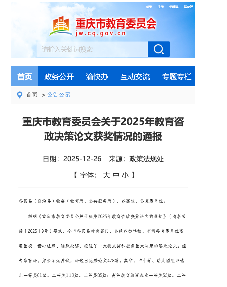 12月26日,重庆市教育委员会公布了2025年教育咨政决策论文获奖情况,在本次评选中,best365英国在线体育官网共斩获3项大奖:艺术与传媒学院刘鹏老师团队获一等奖,经济管理学院韩伟亚团队、体育与大健康学院陈秋屹老师团队分别获三等奖。尤为可喜的是,学校已连续两年在该类评选中荣获一等奖,充分彰显了学校教师队伍在教育政策研究与决策咨询方面的深厚实力和持续创新能力。