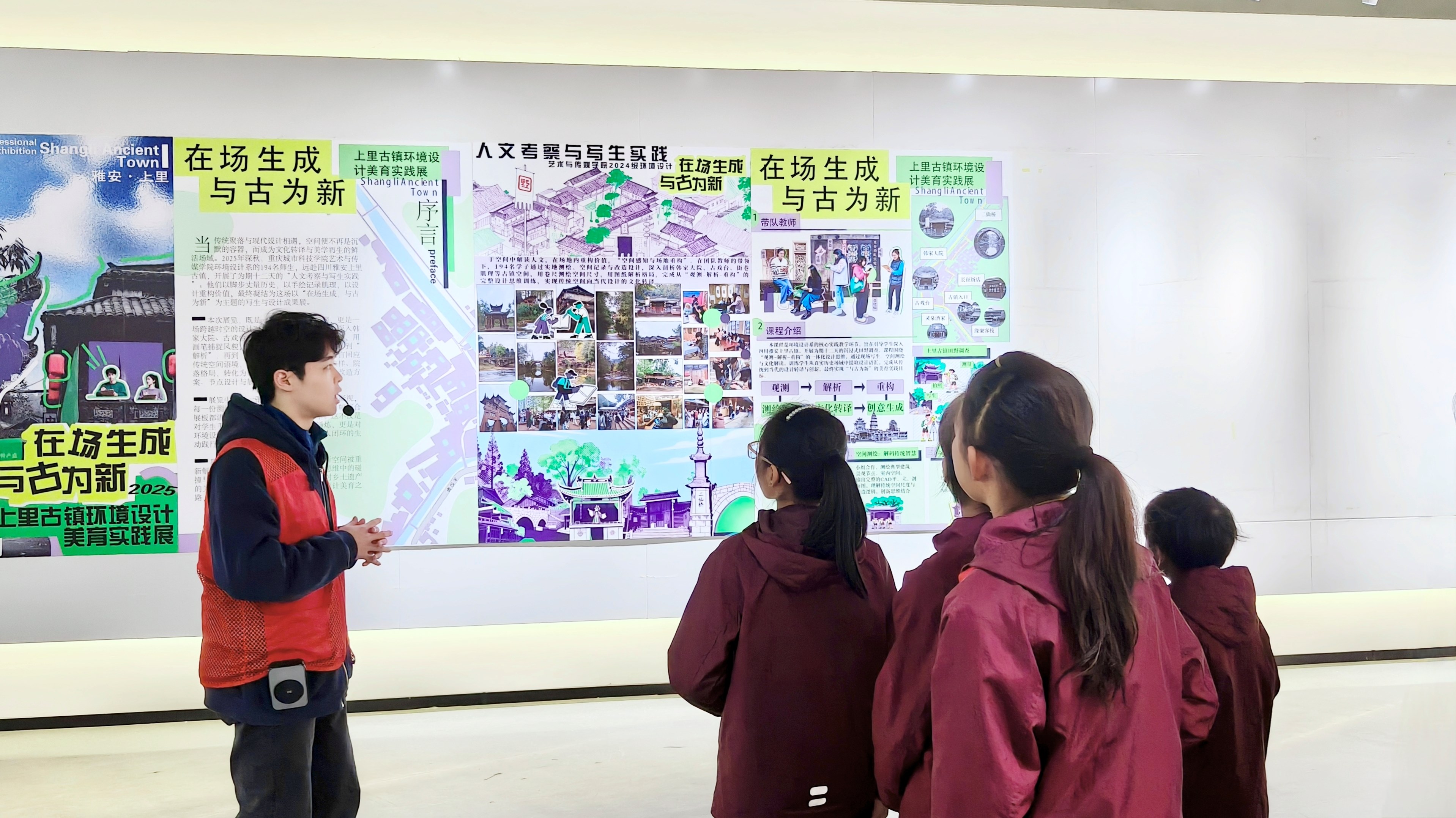 步入求是楼艺术展厅,同学们沉醉于画作与装置艺术构成的视觉盛宴。志愿者以童趣化语言解析创作逻辑与技法,引导他们观察色彩形态、解读符号情感。这场欣赏既以美育浸润心灵,更通过观察分析训练思维,拓宽智识边界。