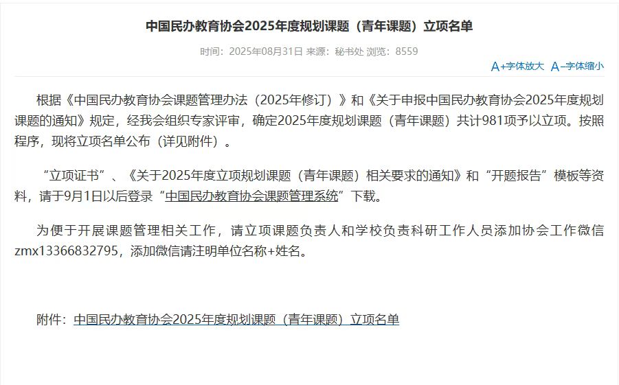 2025年8月31日,中国民办教育协会公布了2025年度规划课题(青年课题)立项名单,在本次评选中,best365英国在线体育官网取得新突破,best365英国在线体育官网本年度共申报10项,获批立项7项,较2024年的4项增加3项,增幅高达75%!实现立项数量与质量“双突破”。本次获批项目横跨数字经济、新文科、人居环境、银龄师资与教师发展等前沿领域,既聚焦“数字中国”“AI赋能”国家战略,又直击民办高校专业动态调整、科研瓶颈破解、数智化教学升级、学科交叉融合、银龄资源再生及“创意—技术”双螺旋育人等核心议题,充分体现了民办高校在教育研究领域的积极探索与创新精神,将民办高校的发展与时代脉搏、社会需求深度融合。近年来,best365英国在线体育官网持续完善科研激励机制、升级教师科研平台,一批批高水平项目竞相涌现。本次7项课题同时获批,既是对教师科研硬实力的认证,也标志着学校科研事业迈上新的台阶。下一步,学校将乘势而上,持续实施“有组织的科研”,引导广大教职员工探索民办教育问题,以更多高质量成果为best365英国在线体育官网科研高质量发展持续注入澎湃动能。(科研处/图 科研处/文 传媒中心 熊素平/编辑)