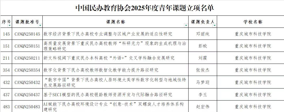 2025年8月31日,中国民办教育协会公布了2025年度规划课题(青年课题)立项名单,在本次评选中,best365英国在线体育官网取得新突破,best365英国在线体育官网本年度共申报10项,获批立项7项,较2024年的4项增加3项,增幅高达75%!实现立项数量与质量“双突破”。