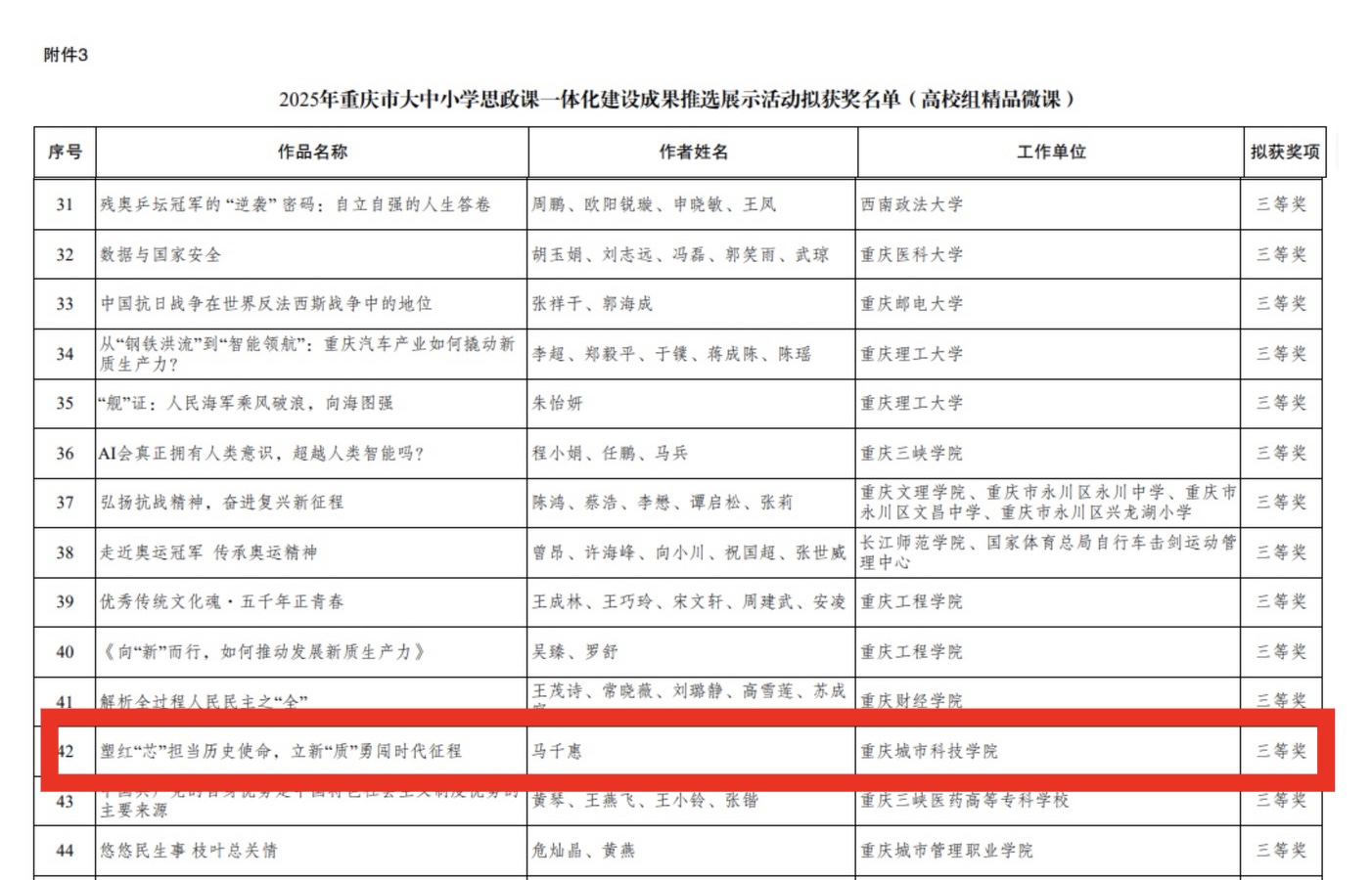 近日,2025年重庆市大中小学思政课一体化建设成果推选展示活动获奖名单正式公布。马克思主义学院教师马千惠设计主讲的微课作品《塑红“芯”担当历史使命,立新“质”勇闯时代征程》在全市众多参赛作品中脱颖而出,荣获高校组精品微课三等奖。 本次活动由中共重庆市委教育工作委员会、中共重庆市委当代党员杂志社联合主办,旨在深入贯彻党的二十大及二十届三中全会精神,全面贯彻落实习近平总书记关于思政课建设的重要指示批示精神,充分展示重庆市“红岩思政”育人品牌在大中小学思政课一体化建设方面取得的显著成效。 本次获奖不仅是学校教师个人教学创新的体现,更是马克思主义学院持续推动思政课高质量发展、积极融入大中小学思政育人共同体建设的重要成果。近年来,马克思主义院高度重视思政课内涵建设,通过集体备课、跨学段教研、资源共享等多种形式,扎实推进内容贯通、机制创新和能力提升,形成了一批可推广、有实效的思政育人成果。 下一步,马克思主义学院将继续坚持以习近平新时代中国特色社会主义思想为指导,深化思政课教学改革,拓展“一体化”建设路径,为推动形成纵向衔接、横向贯通的大思政格局贡献更多力量。(马克思主义学院 图/文 传媒中心 谢秋雨/编辑)