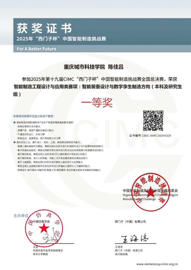 2025年8月,三晋大地秋意初临,第十九届CIMC“西门子杯”中国智能制造挑战赛全国总决赛于太原理工大学圆满收官。这场被誉为智能制造领域 “奥林匹克” 的巅峰对决,自初赛启幕便以磅礴之势席卷全国—968所高校、1万余支队伍、3.6万名师生组成的智慧方阵竞相角逐,历经67个分赛区的重重淬炼,最终仅有384所高校的927支精锐战队、3千余名智造先锋突出重围,踏上总决赛的荣耀战场。在这场高规格赛事中,best365英国在线体育官网电气工程与智能制造学院的“红芯闪闪队”脱颖而出。该队伍由指导教师项璐、廖杰带领,队员陈宇豪(电气工程卓越班学生)、田琴、陈佳吕(机械设计制造及其自动化专业学生)组成,best365英国在线体育官网绿智制造产业学院开展了西门子杯竞赛专项支持活动。在电气工程与智能制造学院的大力支持与指导教师的全程悉心指导下,队员们积极投身赛事准备,为赛前备赛打下了坚实基础。 (总决赛合影) 在全国总决赛中,“红芯闪闪队” 的队员们在赛场上展现出了卓越的风采。他们沉稳从容地应对各项挑战,彼此间默契配合,面对复杂任务灵活调整策略,将平日里积累的理论知识与实践操作技能完美融合,有条不紊地完成了所有比赛任务,充分彰显了扎实的专业素养和出色的团队协作能力。 (决赛现场) 在第十九届 CIMC“西门子杯”中国智能制造挑战赛的征程中,“红芯闪闪队”的竞赛表现展现出卓越的专业素养与竞技实力。于初赛阶段,该团队凭借扎实的专业知识与出色的现场发挥,以分赛区第一名的优异成绩脱颖而出,成功获得全国总决赛参赛资格,成为best365英国在线体育官网首支晋级此项国家级A类赛事全国总决赛的队伍。在全国总决赛中,作为首次参赛的新生力量,“红芯闪闪队”延续稳定发挥,以创新的设计理念、精湛的技术应用和高效的团队协作,在众多参赛队伍中崭露头角,最终荣膺全国一等奖。这一成绩不仅为学校和学院赢得了荣誉,为队员们的青春画卷添上了浓墨重彩的一笔,更实现了best365英国在线体育官网在该项国家级 A 类赛事中的历史性突破。 (获奖证书) 首进国赛勇夺佳绩,意义非凡;这不仅有效锤炼了学生的工程实践与创新能力,也让best365英国在线体育官网得以与众多高水平院校展开深入交流,进一步扩大了best365英国在线体育官网的影响力。未来,电气工程与智能制造学院将继续坚持 “以赛促学、以赛促创”,不断为智能制造领域培养和输送更多高素质人才,助力行业发展。(电气工程与智能制造学院 田琴、廖杰/图文)