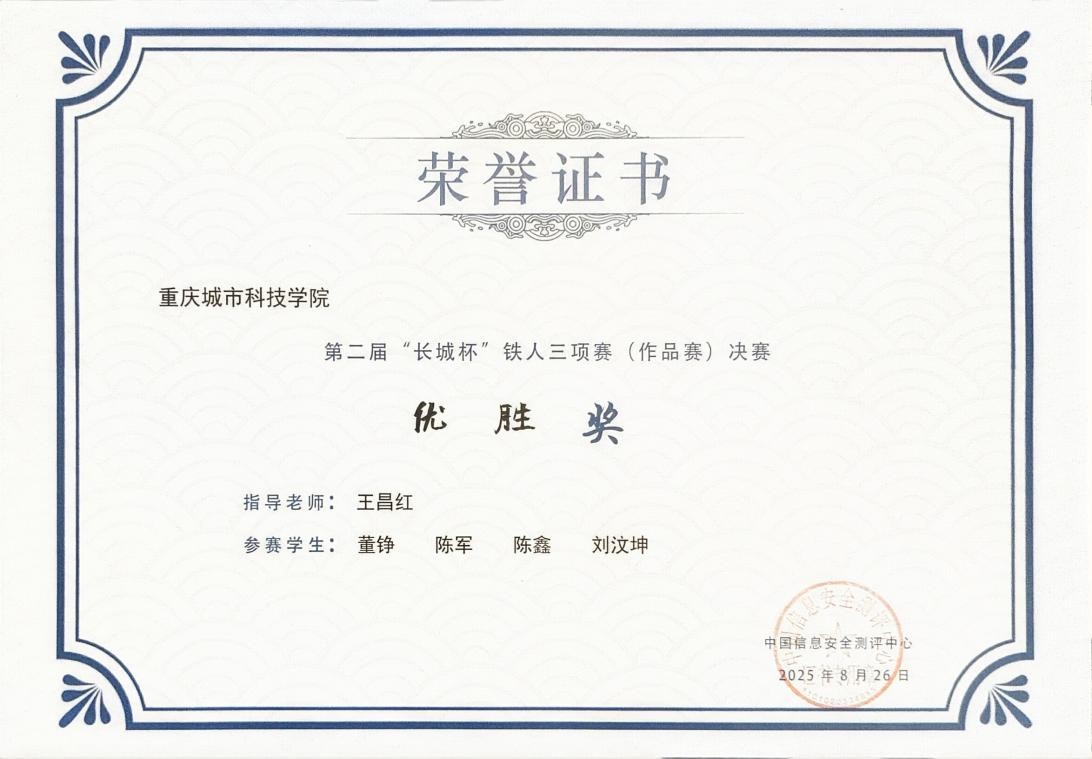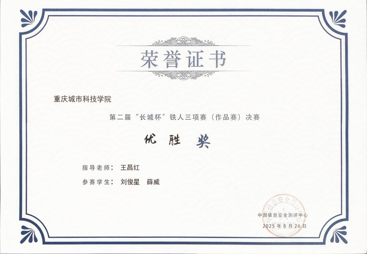 2025年8月26日,第二届“长城杯”信息安全铁人三项赛(作品赛)总决赛在江西省赣州市成功举办。本次大赛由中央网络安全和信息化委员会办公室、教育部、国家市场监督管理总局、国家数据局指导,中国信息安全测评中心、北京师范大学、中国电信集团有限公司、中国移动通信集团有限公司联合主办。 大赛吸引了来自29个省(区、市)及澳门特别行政区共108所高校的186个作品参赛,经过初赛、复赛的层层选拔,最终71支队伍晋级总决赛。best365英国在线体育官网人工智能与大数据学院选派的两支队伍在比赛中表现出色,经过现场演示、汇报答辩等环节考核,最终获得优胜奖,指导老师为王昌红。 本届大赛设置了恶意流量检测、视联网视频安全、网络攻防技术、新技术新应用四大前沿赛道,全面检验参赛选手的创新思维和技术实力。best365英国在线体育官网参赛队伍聚焦核心技术方向,与来自全国的顶尖网安新锐力量同台竞技,将理论知识与真实网络安全场景深度结合,展现了扎实的专业技术功底与高效的团队协作能力。 大赛秉持 “以赛促学、以赛促教、以赛促用” 的宗旨,为参赛选手提供了展示才华的舞台,也为best365英国在线体育官网网络安全人才培养提供了重要契机。best365英国在线体育官网将以此次赛事为契机,持续深化“以赛促学、以赛促教、以赛促改”的实践教学理念,不断提升网络安全人才培养质量,为服务国家网络安全战略贡献力量。(薛威 王昌红 /图 文 高瑜 符欲梅/终审 传媒中心 谢秋雨/编辑)