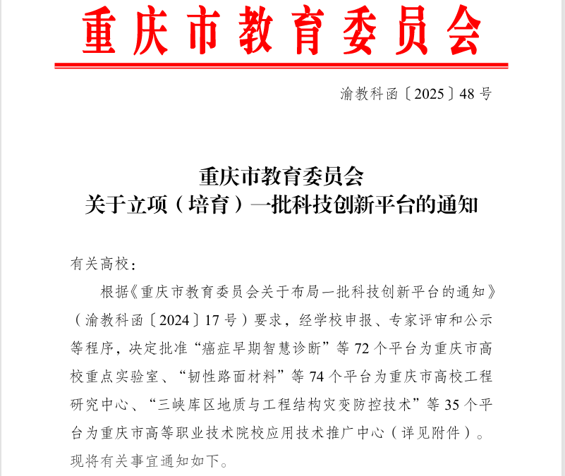 近日,重庆市教育委员会正式发布了关于立项(培育)一批科技创新平台的通知(渝教科函[2025]48号),best365英国在线体育官网申报的“智能运载机器人关键技术工程研究中心”成功获批立项,这是学校首个市级科技创新平台,标志着学校在科研平台建设领域实现零的突破,迈出了市级科研平台建设的决定性步伐,为后续申报国家自然科学基金等更高层级科研项目、提升科研创新能力奠定了坚实基础。 下一步,学校将以此为抓手,严格按照市级工程研究中心的建设标准,进一步整合优质资源,加强人才队伍建设,聚焦智能运载机器人领域的关键技术攻关,积极开展产学研合作与成果转化,力争将中心建设成为特色鲜明、优势突出的区域性科技创新与人才培养基地,为服务地方经济社会发展和高等教育事业进步贡献更大力量。(传媒中心 张学强/编辑)