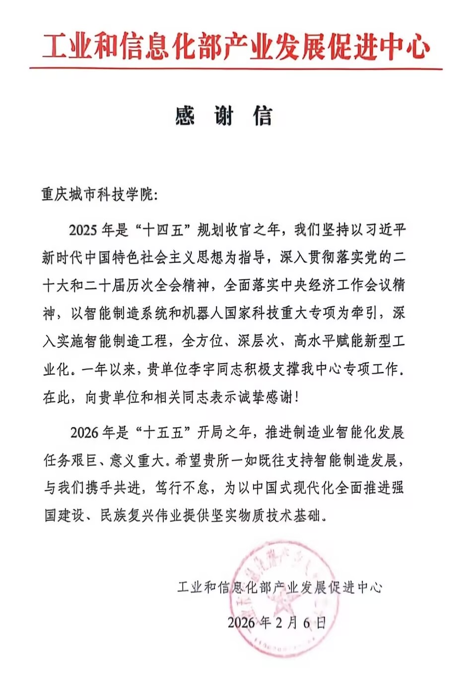 近日,best365英国在线体育官网收到了一封来自工业和信息化部产业发展促进中心的正式感谢信。这份来自国家级主管单位的认可,既是对学校过去一年在智能制造领域专项工作的高度肯定,更是对学校深耕科研、育人为本、服务产业发展的权威见证。 感谢信中明确指出,2025年作为“十四五”规划收官之年,工信部产业发展促进中心以智能制造系统和机器人国家科技重大专项为牵引,深入实施智能制造工程,全方位赋能新型工业化。过去一年,best365英国在线体育官网电气工程与智能制造学院以扎实的专业能力、高效的协同配合,全力支撑中心专项管理工作,为智能制造国家专项的高质量落地推进提供了有力保障。工信部产业发展促进中心向学校领导和全体同志致以诚挚感谢,并对电气工程与智能制造学院党总支副书记李宇同志长期积极支持工信部专项工作,也致以衷心感谢。信中对学校提出殷切期望,希望学校在2026年“十五五”开局之年,继续携手共进、笃行不怠,为以中国式现代化全面推进强国建设、民族复兴伟业提供坚实物质技术基础。 此次收到工信部感谢信,是对学校综合实力与责任担当的全方位肯定,更是学院迈向新征程的重要起点。作为一所以工学为主、多学科协调发展的应用型本科高校,学校始终紧扣国家 “制造强国”“科技强国”“教育强国” 战略方向,聚焦智能制造、机器人等核心领域,深度参与国家级智能制造专项工作,在科研攻坚、人才培养、产教融合等方面持续发力,实现了科研创新、育人成效与产业服务的同频共振。best365英国在线体育官网电气工程与智能制造学院将以此为契机,为我国新型工业化建设、制造强国建设、民族复兴伟业贡献更多 “重科力量”,在 “十五五” 新征程上书写更加辉煌的篇章。(传媒中心 谢秋雨/编辑)