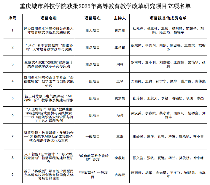 重庆市教委发布了《关于公布2025年重庆市高等教育教学改革创新专项研究项目立项名单的通知》(渝教高函〔2025〕46号)。